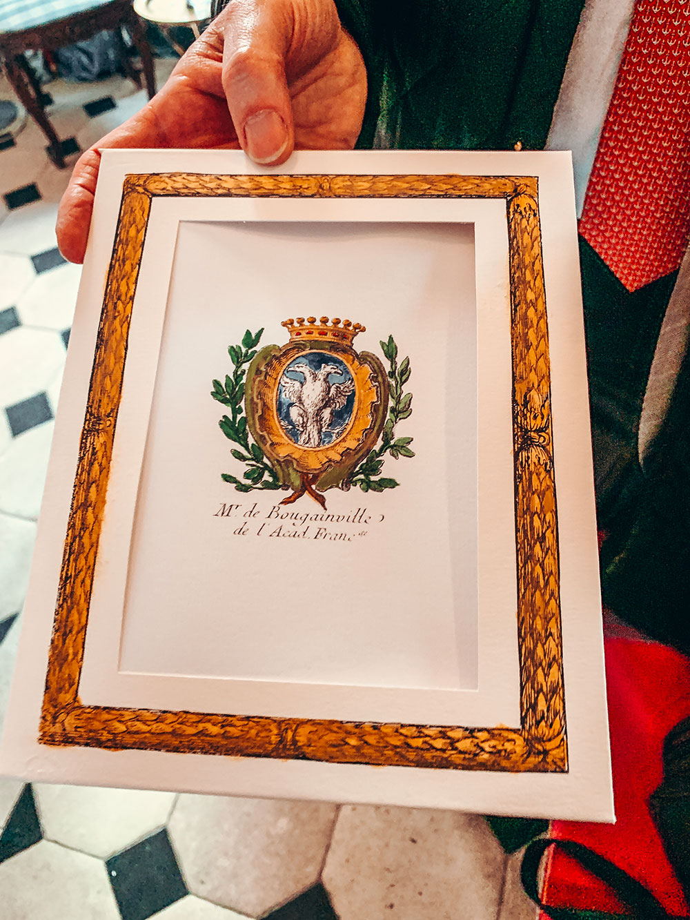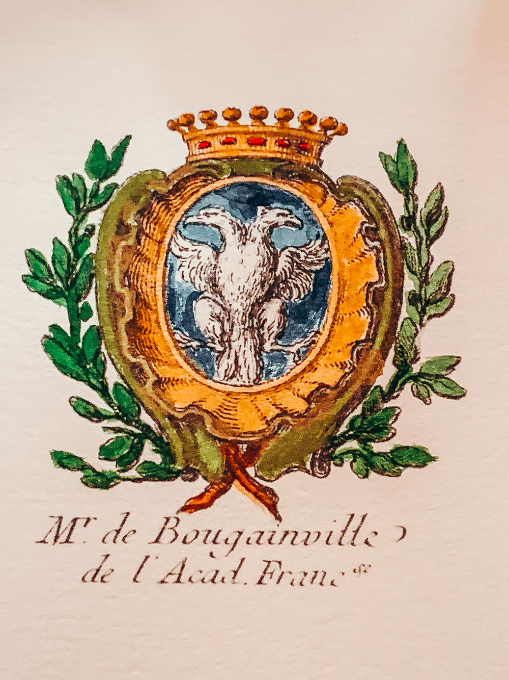On notera que l’écu est timbré d’une couronne de duc, sans s’étonner outre mesure. Cette « inflation héraldique » – sans qu’il ne faille préjuger d’un désir de titre ducal qui n’aurait jamais abouti – est courante au XVIIIème siècle : par exemple, le comte de Tressan ainsi que la comtesse du Barry timbrent de même leurs blasons d’une couronne ducale.