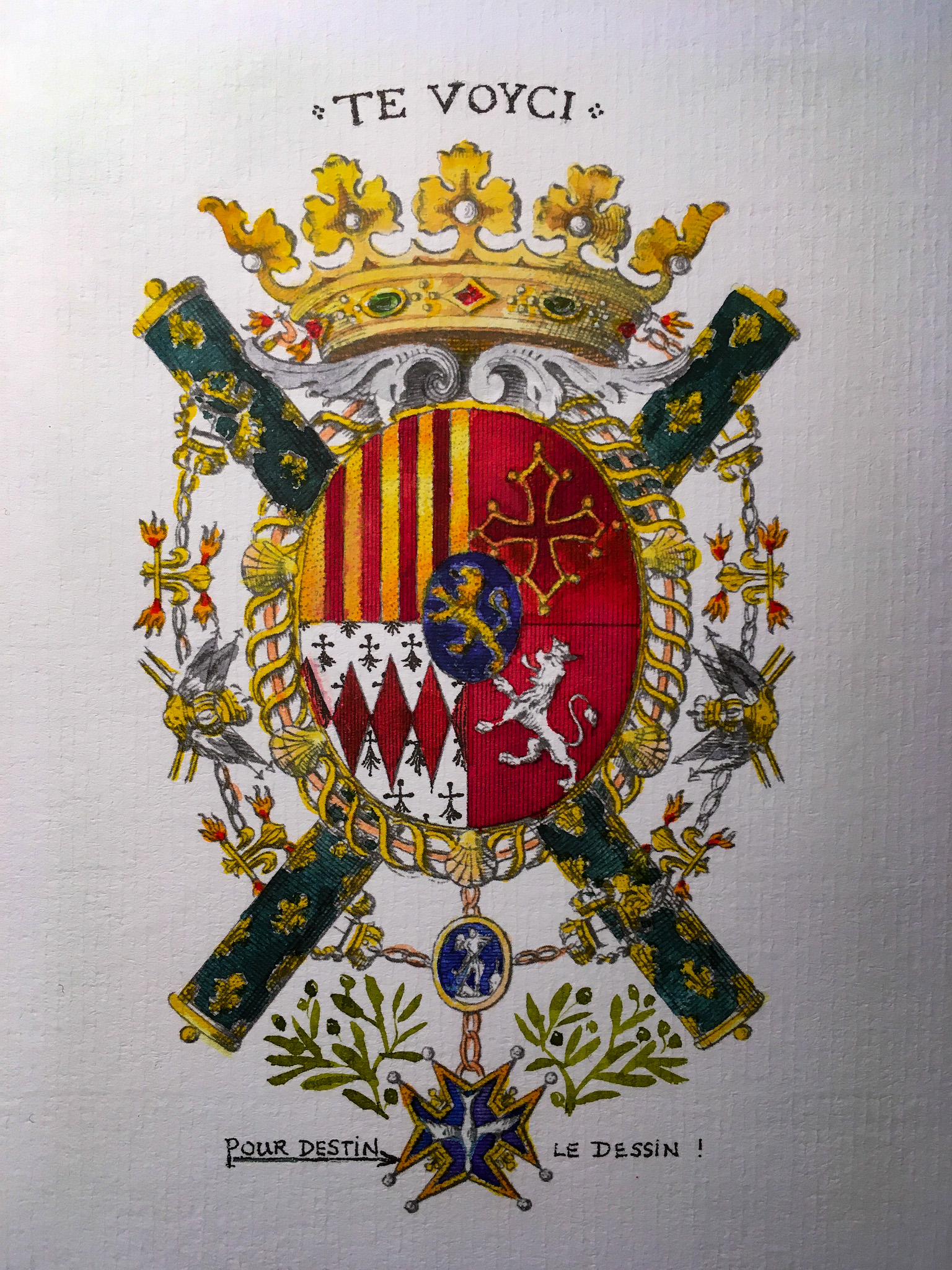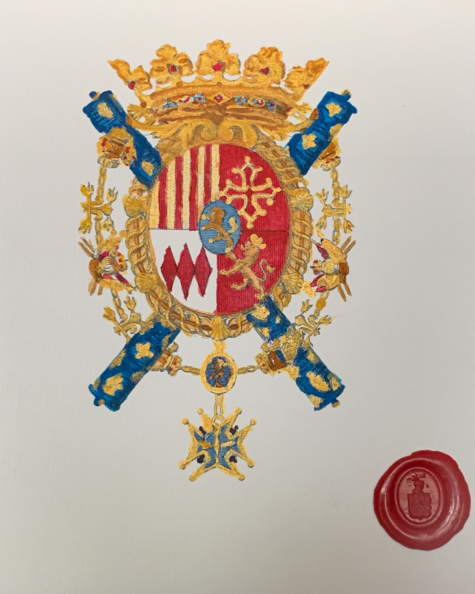 - au 1 : palé d’or et de gueules (qui est Amboise – le maréchal de Lautrec descend en effet de cette illustre famille chevaleresque par son arrière arrière grand-mère Anne d’Amboise (1737 † 1568), épouse de François de Voisins (1520 † 1576)),